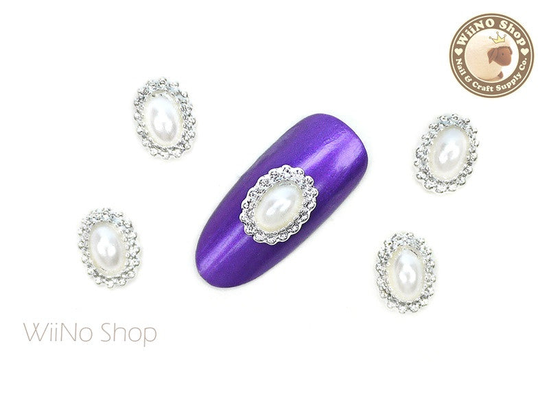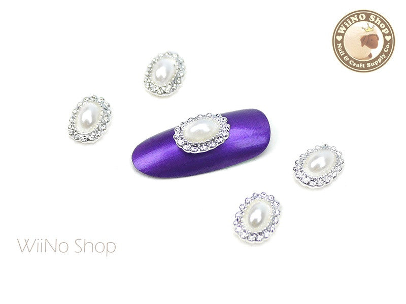 Silver Oval Pearl Beads Frame Nail Metal Charm - 2 pcs