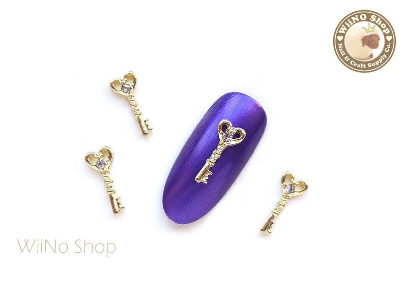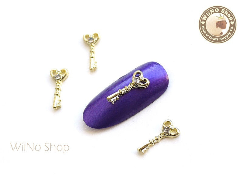 Gold Heart Key with Crystal Nail Metal Charm - 2 pcs