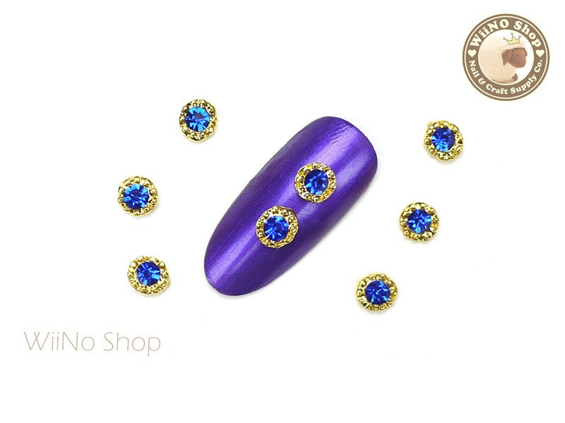 Gold Round with Blue Crystal Nail Metal Charm - 2 pcs