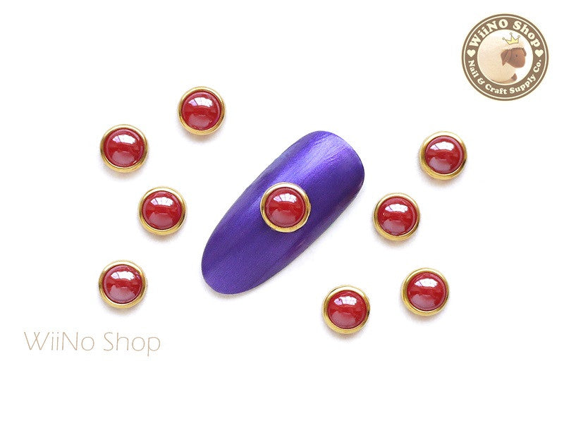 6mm Red Pearlized Glass Stone Gold Rim Cabochon Nail Art Decoration- 10 pcs