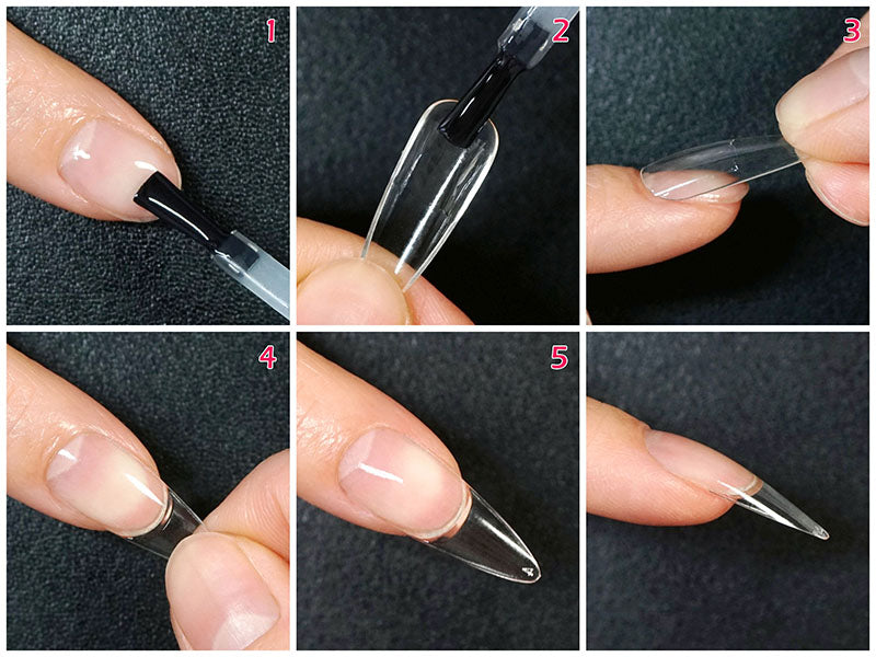 5. Apply another layer of KiiRa Ultimate Extend Base Gel on extension nail tips (on the file area) then slowly press down the extension nail tips from nail top to the end.