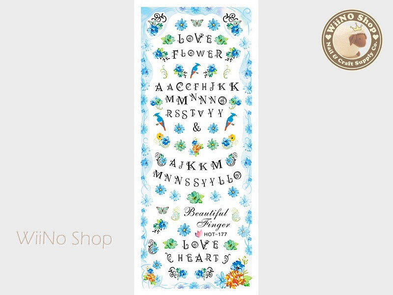 Blue Flower & Letters Water Slide Nail Art Decals - 1pc (HOT-177)
