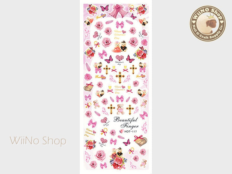Pink Rose Bear Valentine Water Slide Nail Art Decals - 1pc (HOT-117)