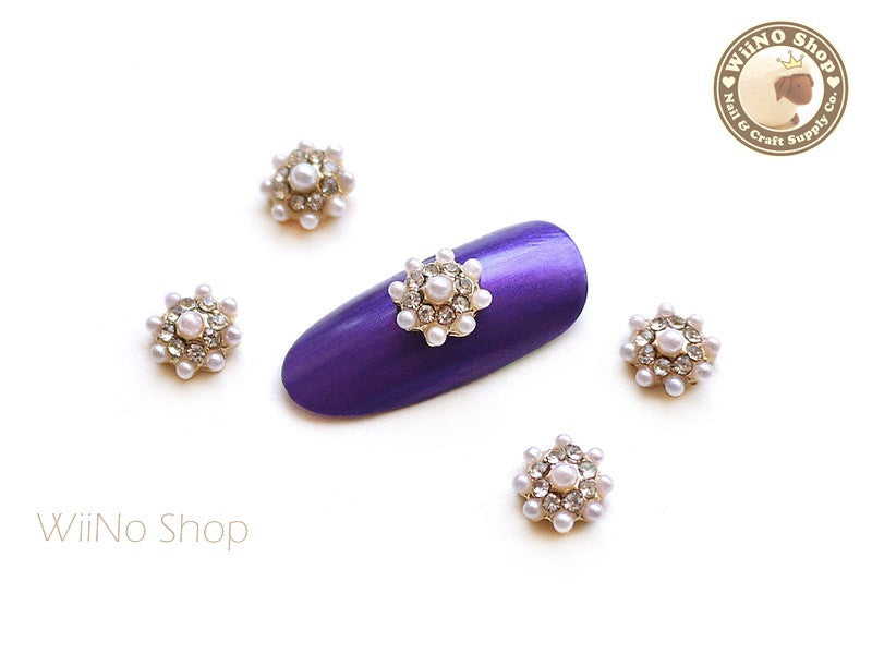 Pearl Crystal Round Flower Cluster Nail Metal Charm - 2 pcs