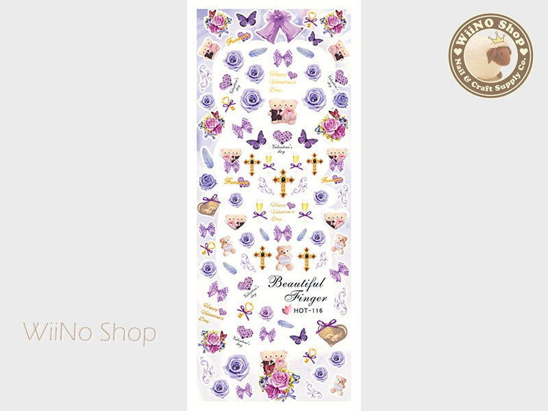 Purple Rose Bear Valentine Water Slide Nail Art Decals - 1pc (HOT-116)
