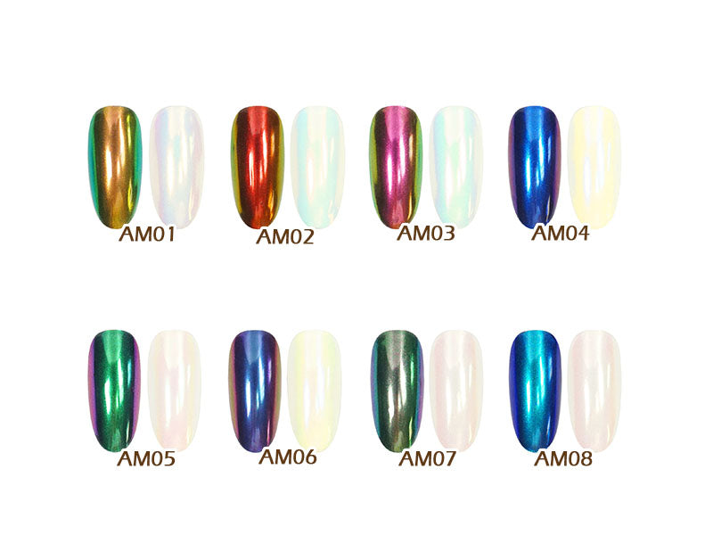 Gently press down the Aurora Moonlight Chrome Powder and brush on your nail and apply evenly.