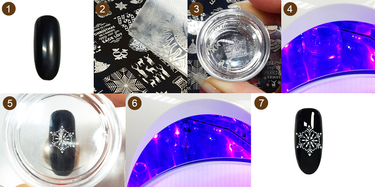 7. Stamp the image on the nail where you want it to be and cure under LED lamp for 30 sec.