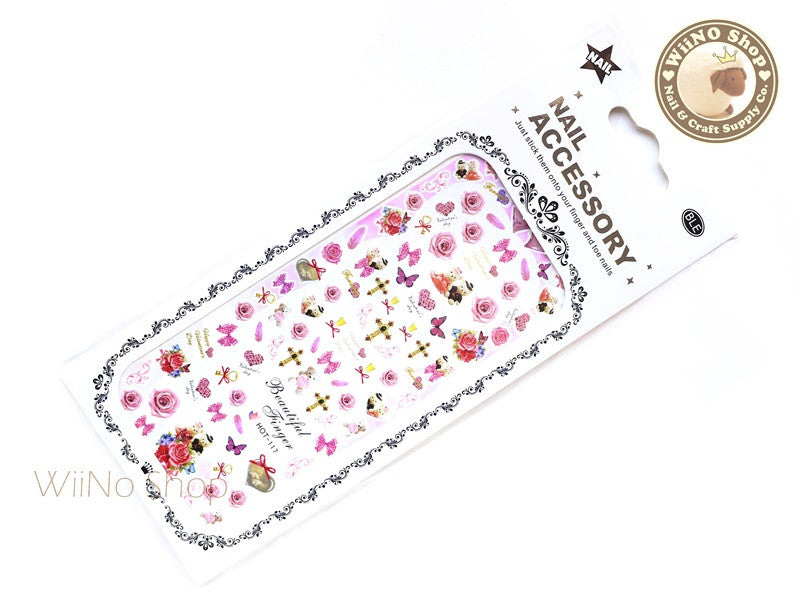 Pink Rose Bear Valentine Water Slide Nail Art Decals - 1pc (HOT-117)