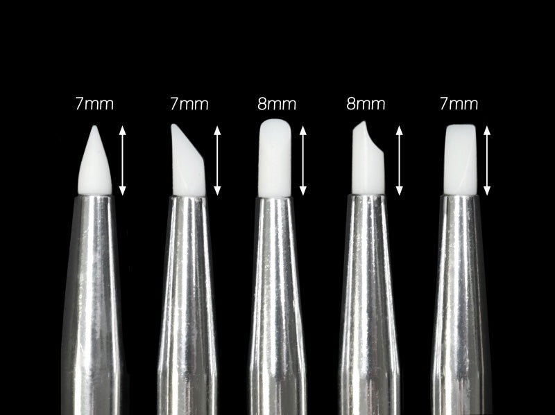 -Set with 5 different shapes of silicone nail art brushes.